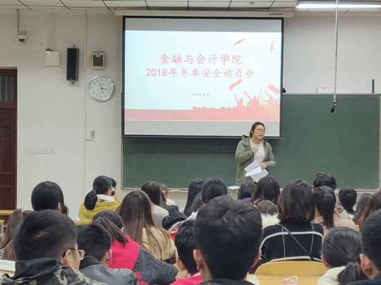 116日下午,金融与会计学院在JX6101教室举行2018年冬季安全稳定动员会,党总支副书记胡晓慧、分团委书记郝瑶、辅导员、各班班长团支书及院学生会各部室负责人参加了会议。会议由院党总支书记胡晓慧主持。