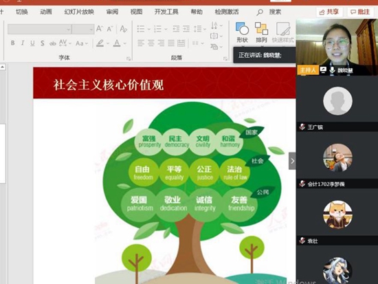 同学们结合自身实际,深入理解社会主义核心价值观的含义,并踊跃发表自己的体会与感悟。有同学说,“生活中随处都应该体现文明素养,比如上课不迟到、课堂不玩手机、校内不吸烟等,这既体现我们的基本素养,也是公民基本的道德。” 有同学谈到,“受疫情影响,虽然这学期还没返校,但是学期初学校为我们邮寄教材、辅导员去宿舍帮我们邮寄电脑等急需物品,让我对社会主义核心价值观有了深刻的认识和体会。”还有同学说:“社会主义核心价值观的践行是全体公民的事,是我们的立身之本,是我们的责任更是义务。我们应从自身做起,从小事做起,人人学习,人人践行。”