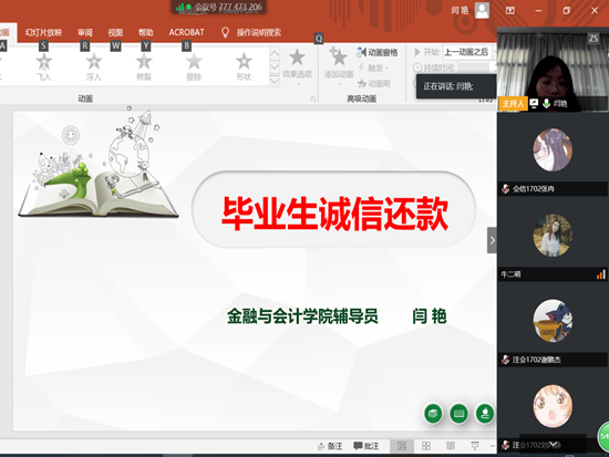 主题班会上,各年级辅导员老师对国家助学贷款还款工作流程、诚信事迹等相关知识做了具体讲解,17级辅导员就毕业生贷款确认等工作做了具体安排,让大家认识到诚信的重要性,自觉履行国家助学贷款合同,提醒同学们一定要诚信贷款、诚信还款。
