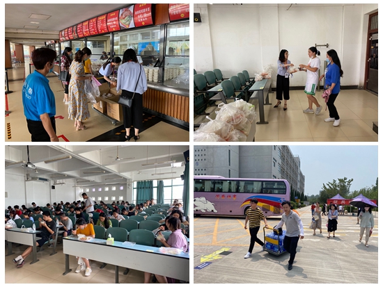 中午11时,烈日下,在副书记胡晓慧的带领下,辅导员老师们汗流浃背,将178份考生午餐提前从餐厅运送到教室,让全体考生在上午考试返回后第一时间集中在教室吃上热腾腾的午饭,免去了去餐厅排队买饭的繁琐,挤出了宝贵的休息时间。