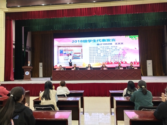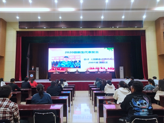 老生代表会计1802班王文文同学发言,她叮嘱学弟学妹们把握今天、认真学习、脚踏实地、积极进取,珍惜大学生活,不断探索创新,在大学的新舞台演出自己梦想中的角色。新生代表注会2001班路际正同学发言,他表示将继续秉承“守诚、求新、创业、修能”的校训,不忘初心、脚踏实地,做努力担当,奋勇拼搏的新时代青年,为学校的双高校建设贡献青春力量。