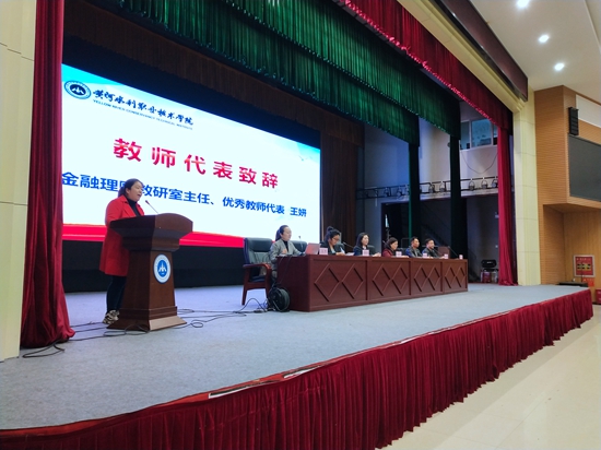 首先是优秀教师代表王妍致辞,王妍希望新生能够在大学的美好时光健康成长,要艰苦奋斗,“投资”心理、“投资”大脑、“投资”身体,遇到挫折和困难不气馁,积极参加各项活动,用最棒的努力,展示最精彩的自己。