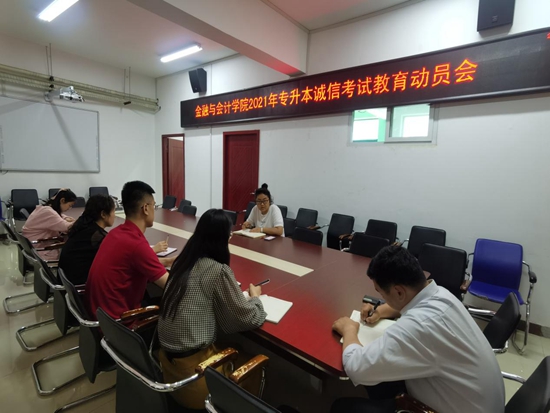 5月24日下午,金融与会计学院在SX5412召开2021年专升本诚信考试教育动员会,金融与会计学院党总支副书记胡晓慧主持会议,金融与会计学院全体辅导员参加会议。会上,胡晓慧副书记着重强调《黄河水利职业技术学院学生违纪处分条例》中关于考试方面的有关规章制度,并要求各位辅导员引导学生不要有作弊思想,杜绝考试作弊现象,鼓励学生要认真复习,沉着应考,强调考风考纪,以阳光心态应对考试并做到诚信考试。