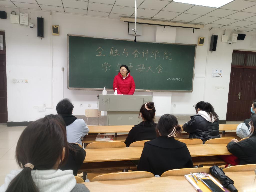 3月7日中午,金融与会计学院学生干部大会在JX6303教室举行,院党总支副书记胡晓慧、分团委书记马峥和所有在校的学生会干部以及各班班长、团支书参加了会议。