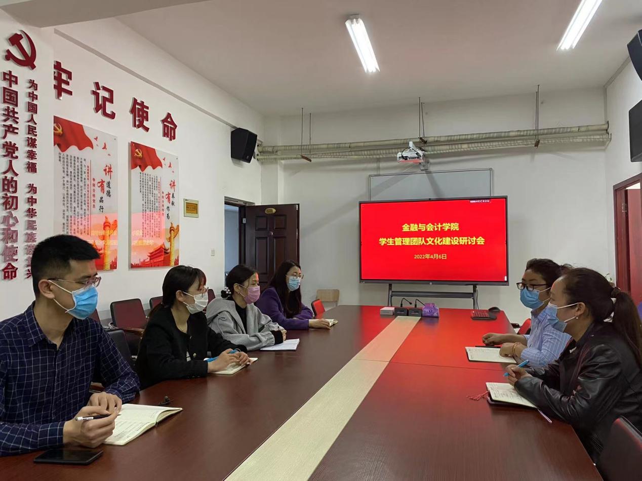 4月6日下午,金融与会计学院在SY5412会议室举行学生管理团队文化建设研讨会,我院全体学工人员参加会议,会议由党总支副书记胡晓慧主持。