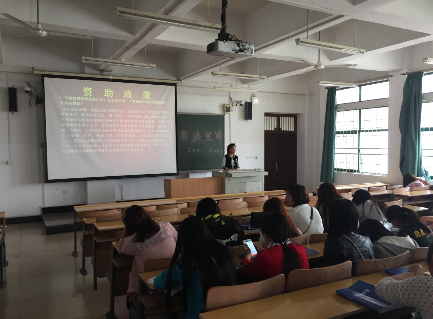 2016年10月14日晚,由财经系资助助理占耀华主讲,给大一的同学召开了资助班会指出我校学生资助的指导思想是“精准资助,资助育人”,秉持着“以人为本,成才第一,德育为先,能力为重”的核心理念,从经济、学业、就业和精神四方面开展资助工作,着眼于发展需求,开展个性化资助,将整体工作由保障型资助向发展型资助转变。随后,针对正在开展的家庭经济困难认定工作和即将开展的奖助学金评选工作做了详细讲解,并着重强调困难认定没有名额限制,申请时也不要有太多心理负担,希望经济困难同学主动参评,在评选中实事求是,不弄虚作假。此次班会普及使国家资助政策深入师生之中,确保国家资助政策顺利实施,确保家庭经济困难学生顺利完成学业,引导他们在获得资助的同时,培养学生的思想政治教育,懂得感恩,关爱他人,关爱社会,对国家和社会有所回报。