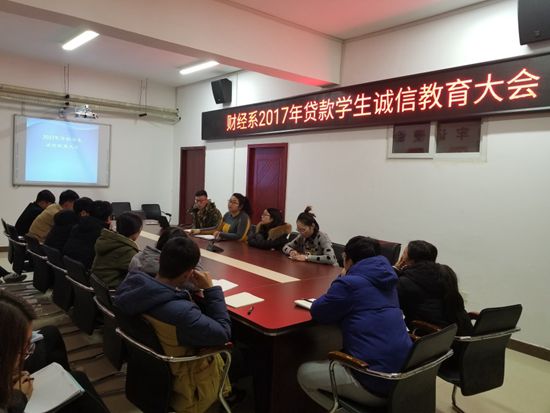 12月15日下午6点10分,财经系于SY5412召开了2017年贷款学生诚信教育大会,系党总支副书记胡晓慧、各年级辅导员以及系全体班团干部参加了本次会议。