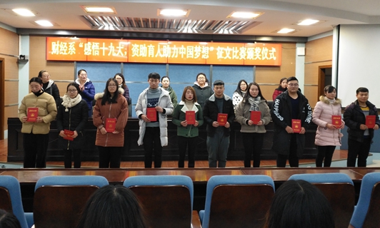 12月20日下午,财经系于3号实训楼学术报告厅举行了“感悟十九大,资助育人助力中国梦”征文比赛颁奖仪式,系党总支书记殷莺、副书记胡晓慧、分团委书记郝瑶以及各年级辅导员参加了本次颁奖仪式。