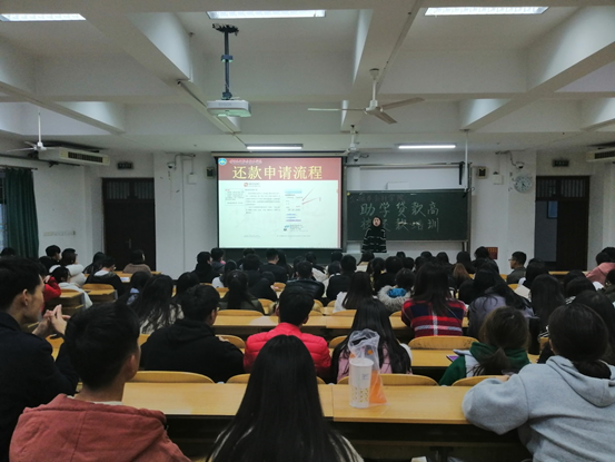 2018年11月27日下午,我院贷款助理蒋甜于JX6202针对高校助学贷款已经申请成功的学生开展了还款培训会。培训会上,助理蒋甜通过PPT详细讲述了还款的具体步骤程序。通过此次培训会,不仅让我院学生了解了助学贷款还款的基本流程和注意事项,解答了他们心中的疑惑,同时也促进了我院资助工作的良性发展。