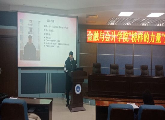 2018年12月18日下午16时,金融与会计学院在三号实训楼学术报告厅召开“榜样的力量”宣讲会。