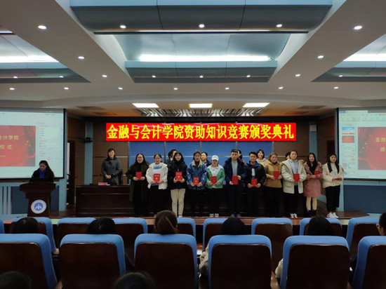 2018年12月18日下午16:30,金融与会计学院在三号实训楼学术报告厅召开资助知识竞赛颁奖典礼。参加颁奖典礼的有院党总支书记殷莺,副书记胡晓慧,分团委书记郝瑶、以及全体辅导员老师和17级、18级学生代表。