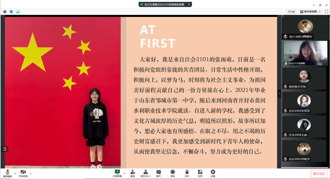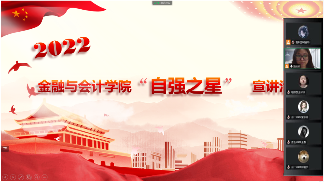 为传承自立自强的中华民族传统美德,弘扬拼搏进取的伟大时代精神,充分发挥榜样的思政引领作用,6月12日上午我院“自强之星”宣讲会以腾讯会议的方式在线上举行。担任此次宣讲的是刚被评为学校“自强之星”的互联网金融2001班王博和注会2101班张雨萌,我院2021级全体学生参加本次宣讲会,会议由我院2021级辅导员王歆然主持。