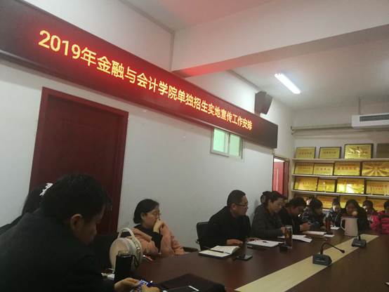 为了进一步做好2019年我校的招生宣传工作,营造良好的招生氛围,作为郑州地区实地宣传的金融与会计学院高度重视2019年的单独招生工作,因此我院在3月5日召开全体教职工招生工作布置会议。根据招生就业服务中心指示精神,我院合理分配好本年度实地招生宣传工作(郑州地区98个目标学校)。最终决定分五路进行招生工作,胡晓慧副书记和张满老师分别带队负责郑州市区的招生工作,孔静带队负责新郑、新密和登封三个地区进行招生工作,闫艳老师带领学生进行荥阳、上街和巩义的招生工作,苏永彪老师负责中牟地区的招生工作,杨士卿老师在校招办带领下配合“升学在线”担任招生讲师。任务重工作量大,但是这并不影响我院的招生工作进行以及全院师生的积极性,每个老师各尽其责、同学们也是毫不松懈。在实地招生途中遇到的困难,如果协调工作做不到位就很难往下进行,在全院师生共同努力下2019年单独招生工作顺利进行。一遍遍的宣讲,一次次的协调,将我校的特色充分展现,进一步扩大我校影响力,最终我们排除万难圆满完成了2019年单独招生实地宣传工作。
