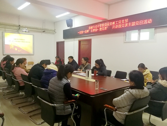2018年11月20日下午15:30,金融与会计学院党总支教工党支部在党员会议室开展了一支部一品牌“云课堂+微党课”开讲微党课主题党日活动,活动由教工党支部书记苏永彪主持,全体教师党员参加。