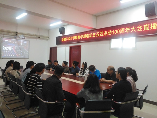 2019年4月30日上午10:30,金融与会计学院党总支、分团委组织党员干部、青年教师代表、学生党员代表、学生团干部代表在SY5412会议室收看纪念五四运动100周年大会的直播。院党总支书记殷莺主持本次活动。