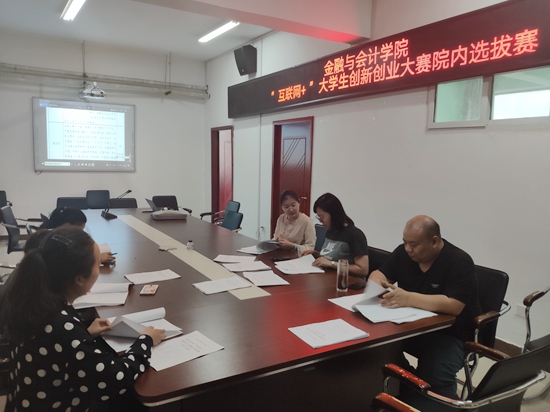 5月16日下午,金融与会计学院于SY5412会议室举行了第五届“互联网+”大学生创新创业大赛院内初选赛。院分团委书记马峥、会计教研室主任胡玉玲、投资理财教研室主任王妍老师、王辉老师共同担任比赛评委,各教研室指导老师代表列席参加。