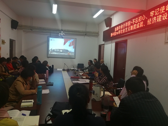 11月12日下午,金融与会计学院在SY5412会议室召开“不忘初心、牢记使命”主题教育新中国70年社会主义制度成就、经济建设成就专题学习会,全体教职工参加。会议由党总支书记殷莺主持。