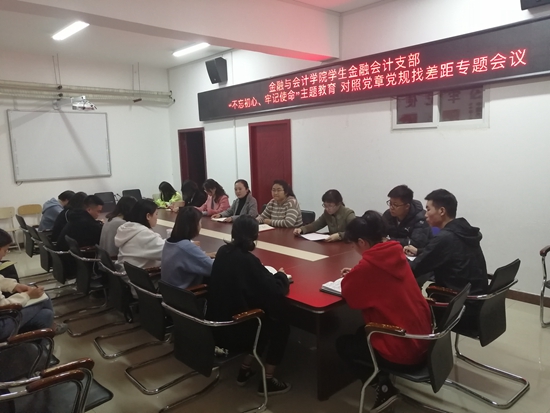 11月13日下午,金融与会计学院党总支学生金融会计支部在SY5412党员会议室召开“不忘初心、牢记使命”主题教育对照党章党规找差距专题会议,支部全体教师党员及在校学生党员参加。会议由支部书记马峥主持。
