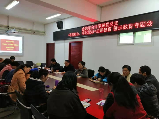 为扎实推动全面发展从严治党向纵深发展,推进党风廉政建设和反腐败工作,引导党员干部提高拒腐防变能力,11月19日下午,金融与会计学院党总支在SY5412党员会议室举行“不忘初心、牢记使命”主题教育警示教育专题会,全体教工党员参加。活动由支部书记刘振威主持。