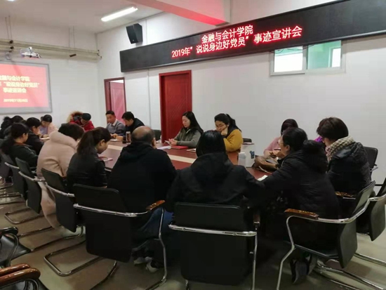 11月26日下午,金融与会计学院党总支在SY5412党员会议室召开2019年“说说身边好党员”事迹宣讲会,全体教工党员参加。活动由教工党支部组织委员杨阳主持。
