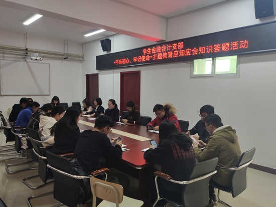 12月5日下午,金融与会计学院学生金融会计支部在SY5412党员会议室开展“不忘初心、牢记使命”主题教育应知应会知识答题活动,支部全体教师党员和学生党员参加。活动由支部书记马峥主持。