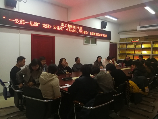 12月5日下午,金融与会计学院教工金融会计支部在SY5412会议室召开“一支部一品牌”党建+云课堂“不忘初心、牢记使命“主题教育知识学习活动,会议由支部书记刘振威主持。