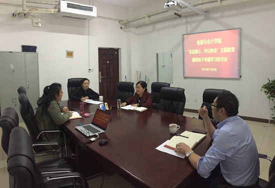 11月4日下午,金融与会计学院在SY5416会议室召开“不忘初心、牢记使命”主题教育领导班子专题研讨会。院党总支书记殷莺、院长宋建涛、副书记胡晓慧、副院长张会丽参加会议。会议由党总支书记殷莺主持。