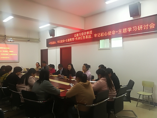 10月15日下午,金融与会计学院在SY5412会议室开展“不忘初心、牢记使命”主题教育“传承红色基因、牢记初心使命”主题学习研讨会,全体教工党员参加。会议由党总支书记殷莺主持。