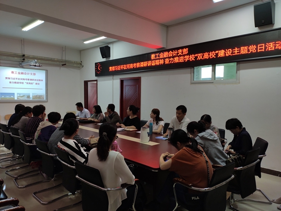 9月24日下午,教工金融会计党支部在SY5412党员会议室举行贯彻习近平在河南考察调研讲话精神 奋力推进学校“双高校”建设主题党日活动,全体教工党员参加。活动由支部组织委员杨阳主持。