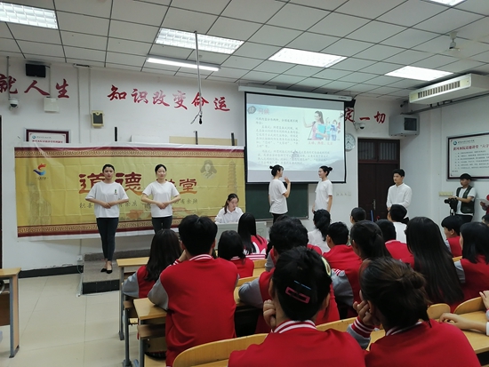 活动分为唱一首歌曲、看一部短片、学一点礼仪、诵一段经典、讲一个故事、做一个承诺、作一番点评、送一份吉祥等8个环节。活动在会计信息1802孙一然同学带领大家学唱《公民道德歌》中拉开帷幕,与会师生在“道德重如山,道德贵似金”的歌声中感受道德的力量;通过观看学习2017年“感动中国”年度人物“兰小草”王珏的事迹,大家接受心灵的洗礼,为其无私奉献的精神所感动;在学习社交礼仪、诵读经典《弟子规》、分享雷锋助人为乐的小故事之后,全体师生进行庄严承诺,承诺要做合格的公民,帮助他人,服务社会,弘扬优秀传统文化,共建和谐校园;胡书记对此次道德讲堂做出点评,她指出,希望同学们严于律己,遵守道德规范,践行社会主义核心价值观,争做一名合格的当代大学生;最后,我院“小水滴·温暖童心”志愿服务队讲述开封市道德模范刘传真老人和她的爱心辅导站的事迹,并发出倡议,号召同学们捐献文具、书本给爱心辅导站的留守儿童,得到与会师生的大力相应,师生纷纷拿出准备好的捐赠文具放入捐赠箱,一并送上对刘传真老师的真挚祝福。
