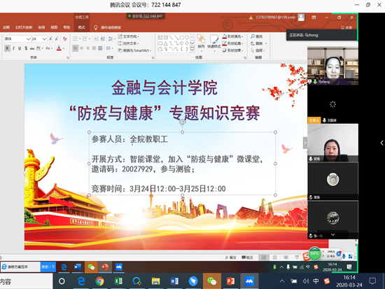 为引导全院教职工强化防控知识学习,增强自我防护意识,提升文明素养,促进身心健康,金融与会计学院3月24日运用“智慧校园-智能课堂”平台举行了全体教职工线上“防疫与健康”专题知识竞赛活动。