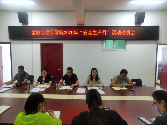 6月16日是全国安全宣传咨询日。上午,金融与会计学院在SY5412会议室召开2020年“安全生产月”活动动员会,院领导班子成员、全体科级干部参加会议,会议由院长宋建涛主持。动员会深入传达了学校2020年“安全生产月”活动实施方案。