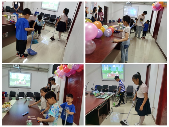小朋友们与“小水滴”志愿者共同打扫会议室卫生
