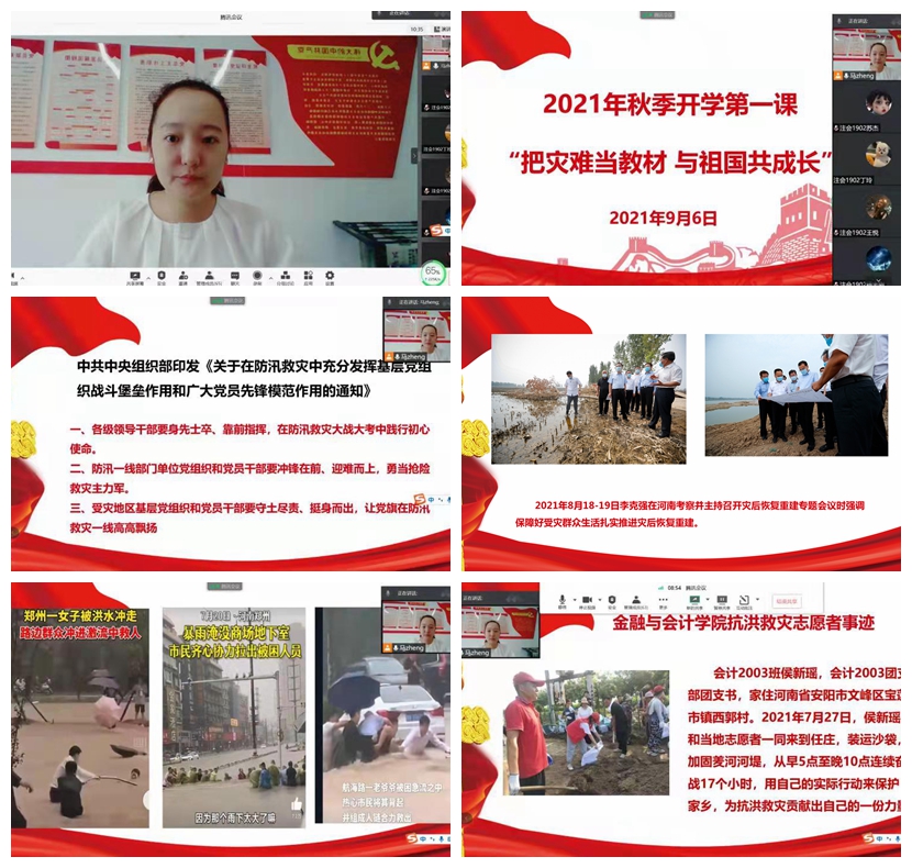 开学以来,全体教师认真备课,全体党员率先垂范,把疫情防控、灾后重建与党史学习教育统筹起来,突出“把灾难当教材,与祖国共成长”主题教育,把防汛救灾、抗击疫情融入课堂教学,深入挖掘课程思政典型案例,进一步总结凝练抗疫救灾故事,弘扬生命至上、举国同心、舍生忘死、尊重科学、命运与共的伟大抗疫精神,引导广大学生涵养家国情怀、砥砺奋斗精神,培养堪当民族复兴大任的时代新人。