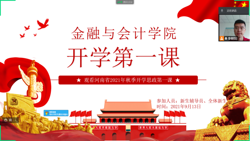 为做好2021级新生入学教育,帮助新生适应大学学习生活环境,提升大学生综合素质,结合当前疫情常态化防控形势,根据学校安排,金融与会计学院2021级辅导员李朝阳、王歆然两位老师于2021年9月13日——18日通过腾讯会议以线上形式开展了入学教育系列活动。本次新生入学教育主要围绕思想政治教育、校情校史、党史教育、专业情况介绍、职业发展与就业指导以及心理健康教育等主题开展了一系列教育活动。