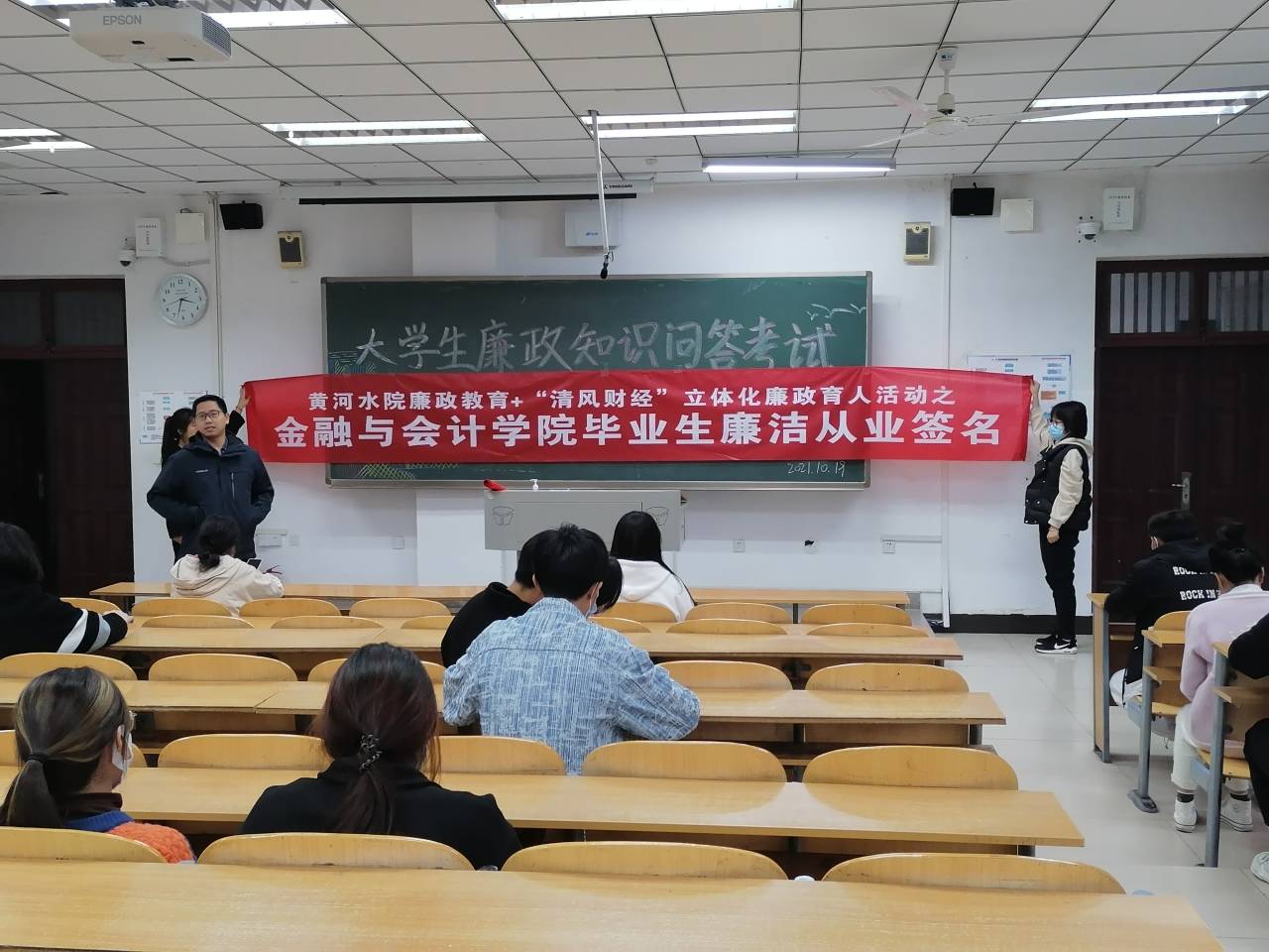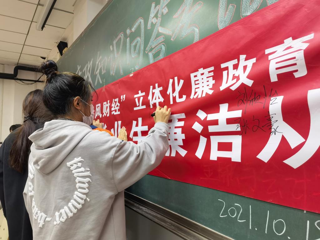 为深入学习贯彻习近平新时代中国特色社会主义思想,进一步营造风清气正的校园育人环境,教育引导广大学生严守职业道德,坚持廉洁从业,弘扬廉洁文化。11月15日,教工金融会计支部组织开展毕业生廉洁从业签名活动,2019级全体毕业班学生参加活动。活动由教工金融会计支部书记刘振威主持。