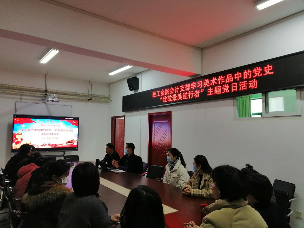 为加强党史学习教育,学习贯彻落实党的十九届六中全会精神,进一步增强党员的使命感和责任感,1228日下午,教工金融会计支部举行了学习美术作品中的党史“致敬——最美逆行者”主题党日活动,教工支部全体党员参加。主题党日活动由支部书记刘振威主持。