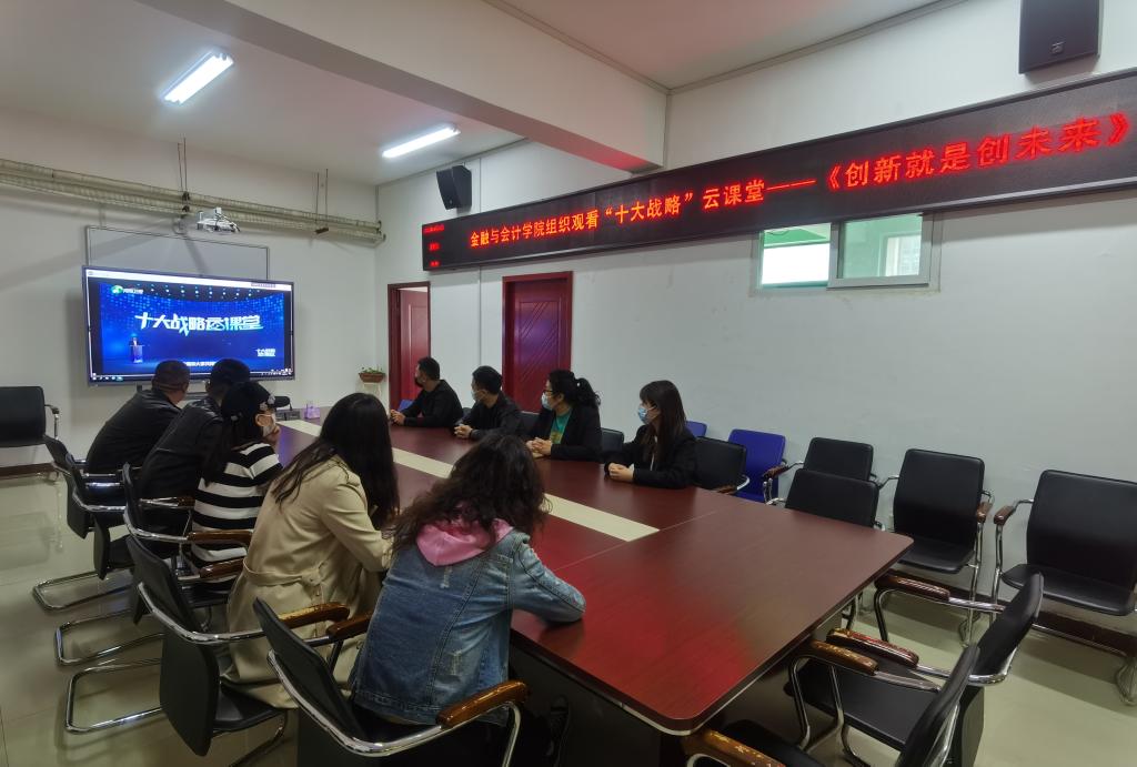 4月14日上午,金融与会计学院在SY5412组织教师收看了省委组织部制作“十大战略”云课堂第一期节目《创新就是创未来》直播栏目。