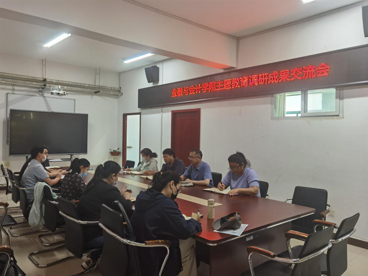 为进一步深入学习贯彻习近平新时代中国特色社会主义思想和党的二十大精神,不断改进工作作风,积极发挥调查研究在学院决策、破解难题和推动发展方面的重要作用,6月6日上午,金融与会计学院在SY5412召开主题教育调研成果交流会,科级以上干部参会。会议由党总支书记吴宗奎主持。