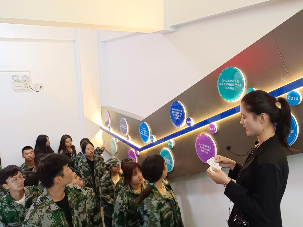 “欢迎来到金融与会计学院智慧财经实训中心,这里将是我们锻炼财务技能的学习基地,也是我们一展风采的实战课堂。我院成立于1953年,在70年的发展中,培养了众多优秀的金融会计行业骨干,一路成长,一路载誉。请大家看看走廊两边展示的我国财经名家的事迹,这才是我们的偶像和榜样”随着学长学姐亲切又专业的讲解,2023级新生饶有兴趣的开始了参观。