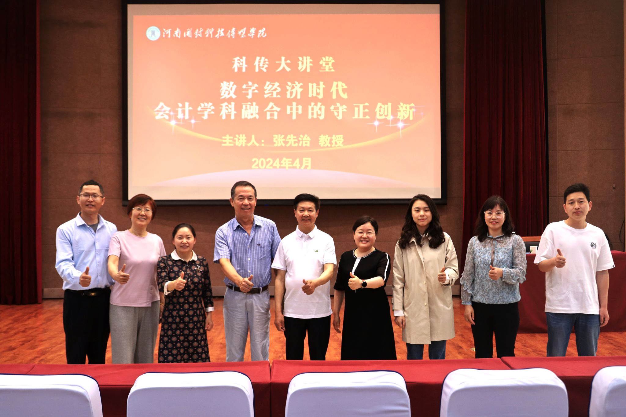 4月26日下午,金融与会计学院大数据与会计专业教学团队一行8人由副院长张会丽带队,赴河南开封科技传媒学院聆听张先治教授的“数字经济时代会计学科融合中的守正创新”专题讲座。讲座由我校会计大师工作室负责人、大数据与会计专业校外专业带头人刘建中教授主持。