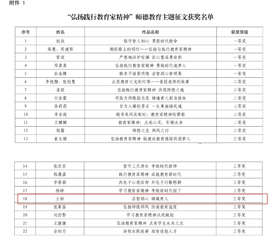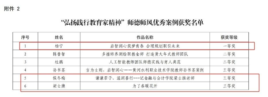 近日,学校教师工作部公布了2024年“弘扬教育家精神”师德主题教育征文、师德师风案例评选结果通知,金融与会计学院取得亮眼成绩。王妍老师获得师德主题教育征文三等奖,杨宁老师获得师德师风优秀案例评选一等奖,侯冬梅、梁士旗老师分别获得师德师风优秀案例评选三等奖。