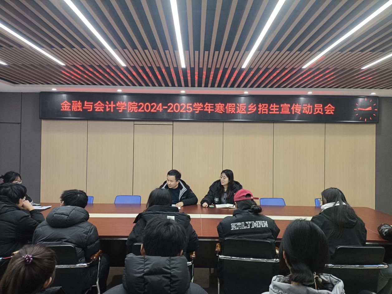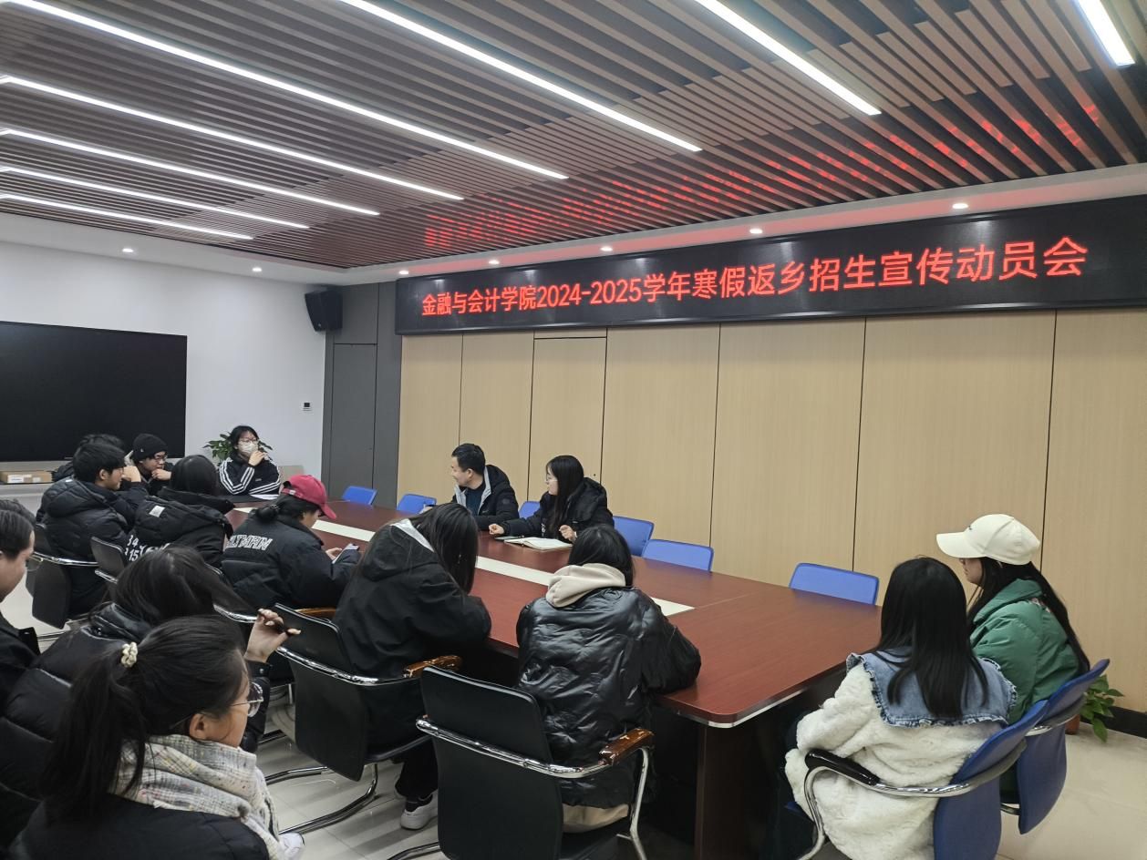为进一步做好我校的招生宣传工作,增进学校与生源高中了解与沟通,让更多的考生了解我校的办学特色,同时丰富我校学生假期生活,提高学生社会实践能力,更好地讲好大学校园故事、传递成长声音、展现高校青年形象,12月23日中午,金融与会计学院组织学生在SY5412会议室开展2024-2025学年寒假返校招生宣传动员会。