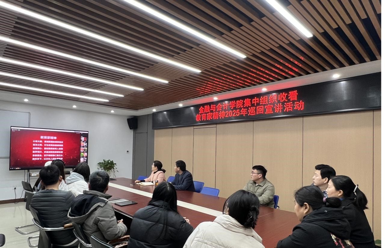 教育部主办的“教育家精神2025年巡回宣讲活动”正式走进河南。2025年2月26日上午,金融与会计学院在SY5412组织教师集中收看宣讲直播,深入学习新时代教育家精神的深刻内涵,激励师生以教育家为榜样,践行育人使命,为教育强国建设贡献力量。