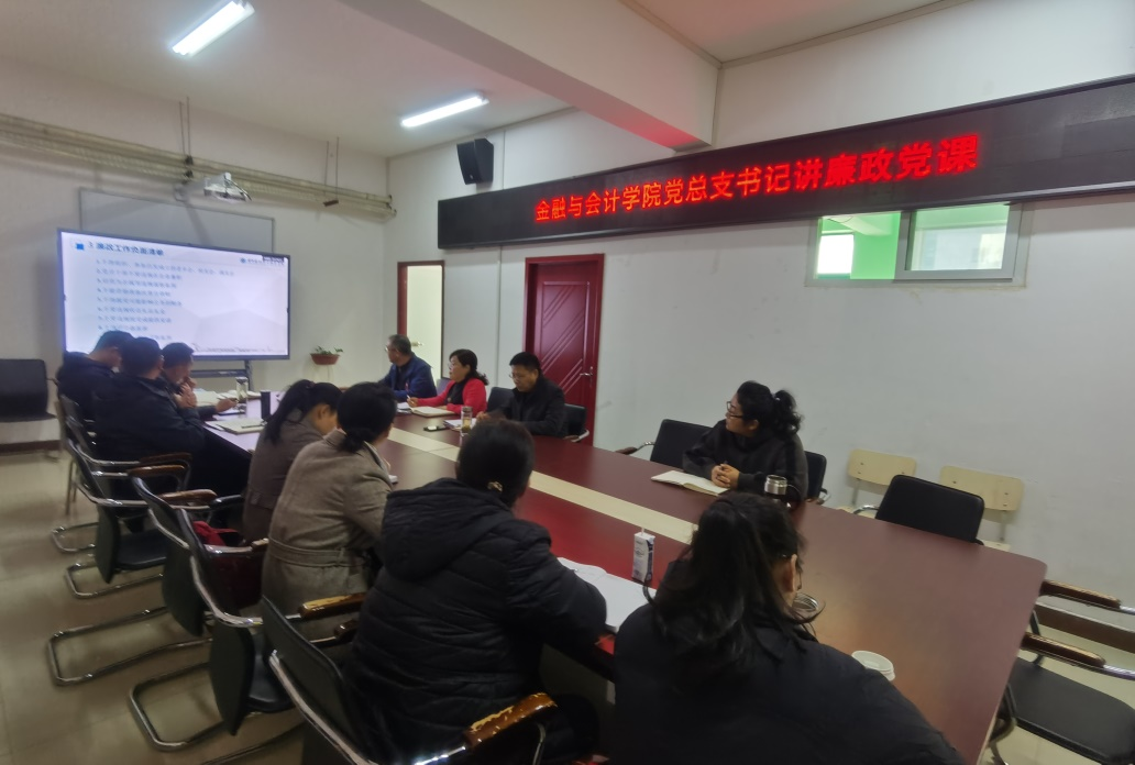 为深入落实全面从严治党主体责任,切实增强领导干部廉政意识,自觉抵制各类诱惑,筑牢拒腐防变思想防线,11月14日上午,金融与会计学院党总支书记吴宗奎以《坚守底线,做清廉干部》为题,为学院全体领导干部上廉政党课。
