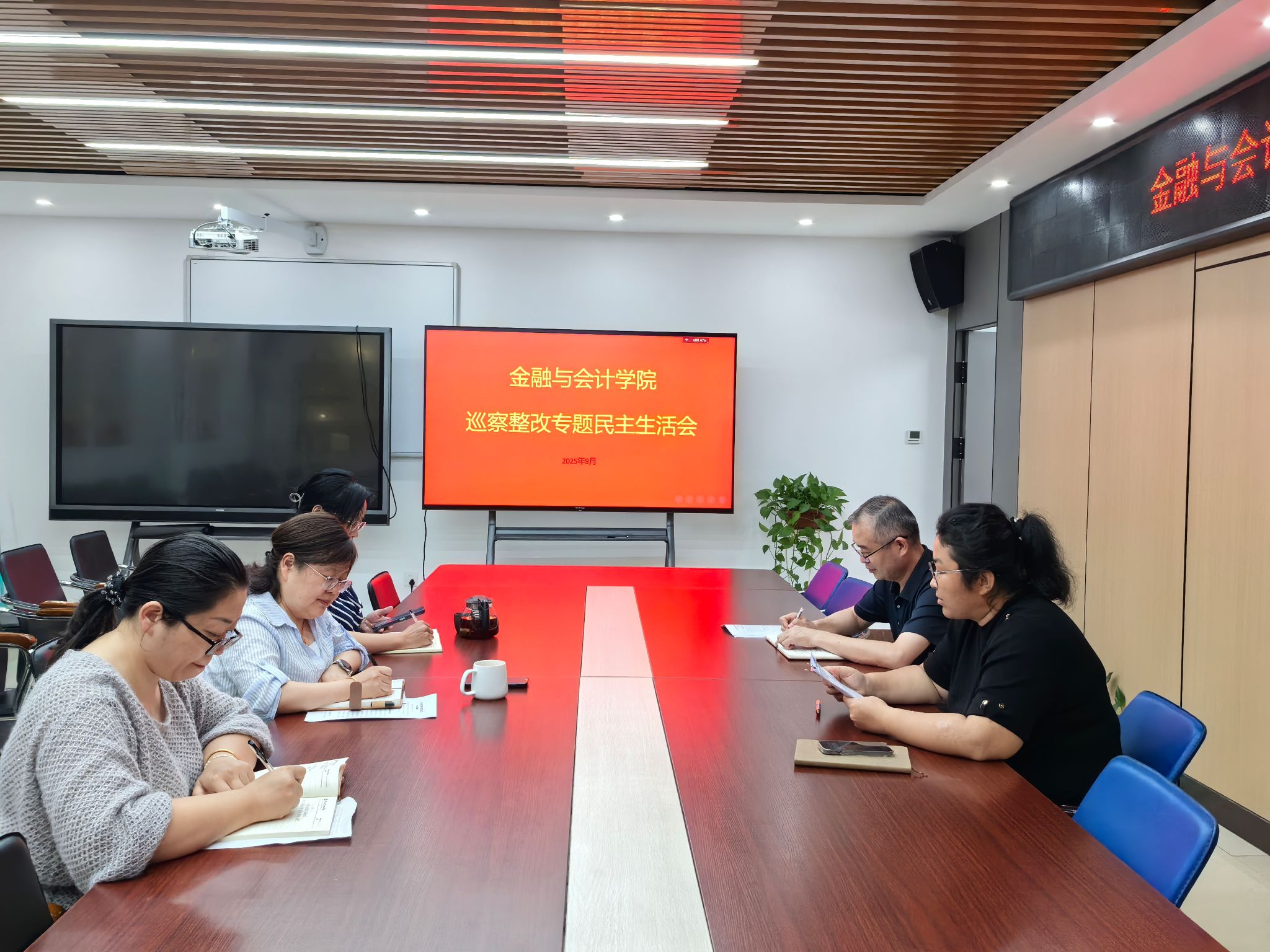9月12日下午,金融与会计学院在SY5412会议室召开巡察整改专题民主生活会,院党总支书记胡晓慧、院长吴宗奎、院党总支副书记霍卫红、副院长张会丽、副院长舒莎参加。党总支办公室主任马峥列席会议。会议由党总支书记胡晓慧主持。