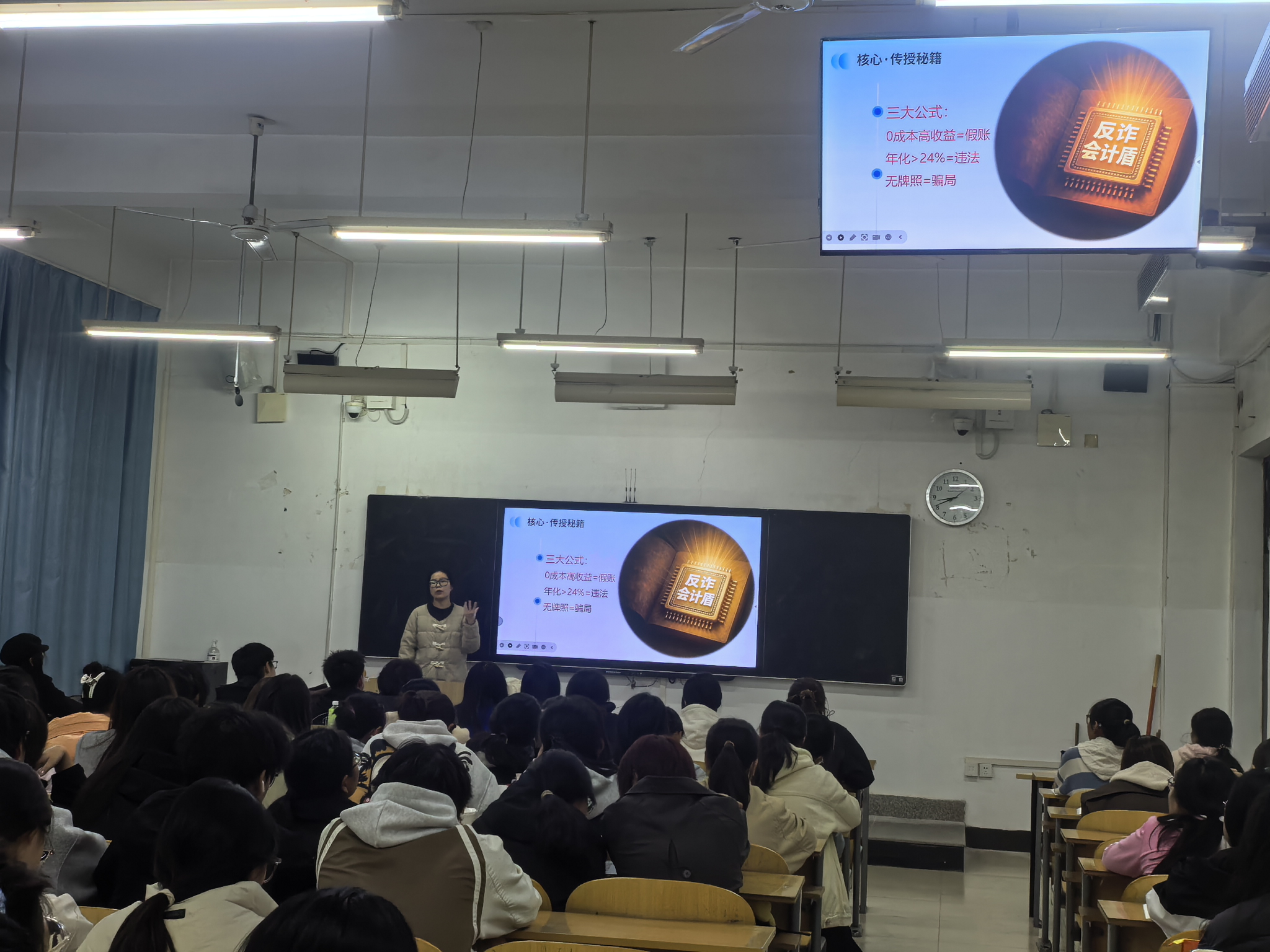讲座中,闫艳老师以“天上不会掉馅饼,只会掉陷阱”为切入点,生动提炼出“三大识别公式”,帮助同学们快速构建反诈思维框架。公式一:任何标榜“零成本、高收益”的项目,其本质都可与财务上的“假账”划上等号;公式二:任何承诺超过24%年化收益率的投资,都已触及法律红线;公式三:任何没有国家认证牌照的金融平台,都可直接判定为骗局。这些简明清晰的判断准则,将专业会计理念融入反诈场景,使学生在理性认知中筑牢第一道防线。