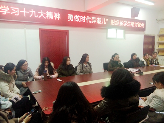 为贯彻落实十九大的主要内容,在学生中间宣传十九大精神,12月18日中午,财经系在SY5412召开“学习十九大精神 勇做时代弄潮儿”主题讨论会。参加此次讨论会的有分团委书记郝瑶及学生干部代表。