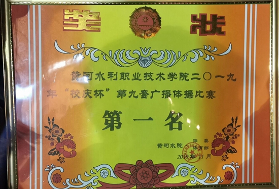 为增强大学生的身体素质,展现同学们积极进取、奋发向上的精神风貌,努力成为德智体美劳全面发展的社会主义合格接班人,我院广播体操代表队于2019年11月8日下午在风雨球场参加了2019年“校庆杯”第九套广播体操比赛并荣获第一名。