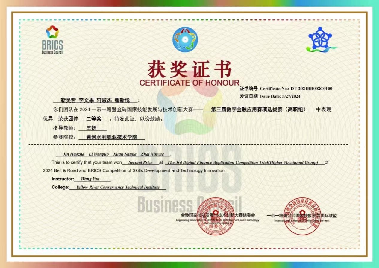 2024年5月11日,2024一带一路暨金砖国家技能发展与技术创新大赛(中国赛区)第三届数字金融应用赛项决赛在线上成功举办。我校选派靳昊哲、李文果、轩淑杰、翟新悦四位同学组成代表队参赛,荣获国赛二等奖,学校荣获优秀组织奖。